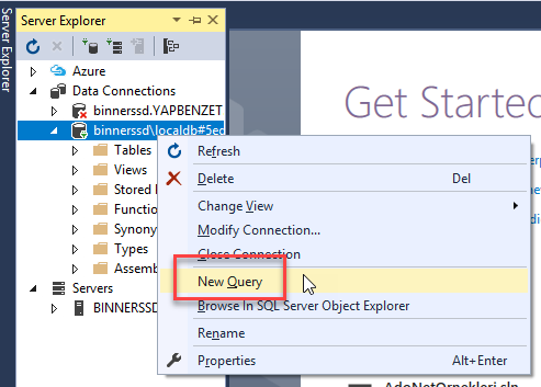 Localdb bağlantı düğümünü sağ tıklatın ve Yeni Sorgu seçeneğini seçin.